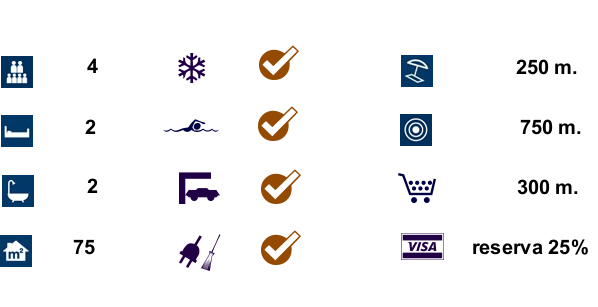 Kвартира, полностью меблирована, на 3 этаже, около 75 метров с двумя спальнями, ванной комнатой с джакузи, туалет, кухня, гостиная, диван-кровать, балкон, холодильник, микроволновая печь, кофеварка, тостер, утюг, телевизор и гараж. В комплексе есть бассейн для взрослых и детей, джакузи, теннис, сады и консьерж. Он находится в районе яхт-клуба около 250 метров от пляжа, набережной La Marineta, рядом со всеми удобствами, в 700 метрах от центра города Дения. Расходы на жилье, полотенца, постельное белье, уборку и гараж включены.